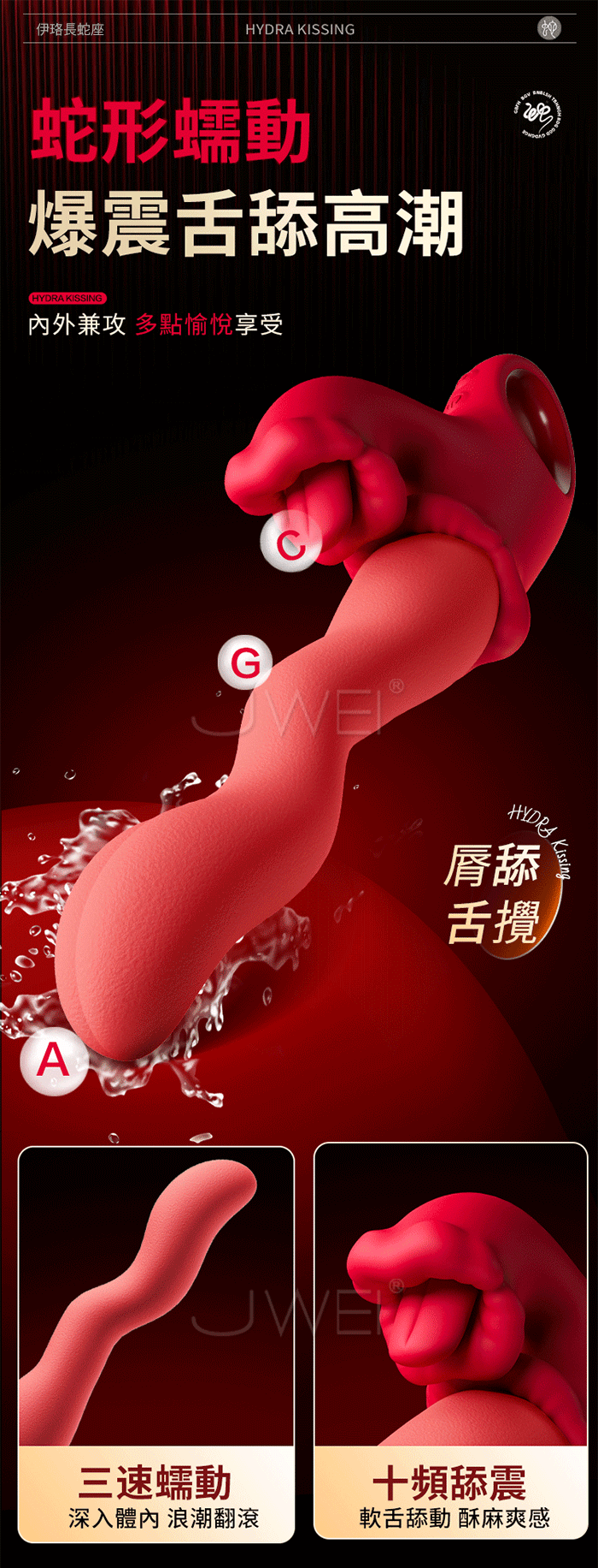 1.蛇形分段式蠕動,波浪刺激 2.強震舌舔,深入銷魂 3.尺寸適中,不撐大私處 4.雙震拍打,內外爆激 5.液態矽膠,安心可口含 6..全身防水,玩法多樣 7.磁吸充電,長效續航 產品規格 ■尺寸:大小詳如圖片標示 ■材質:TPE+ABS ■功能:3速蠕動、10頻震動