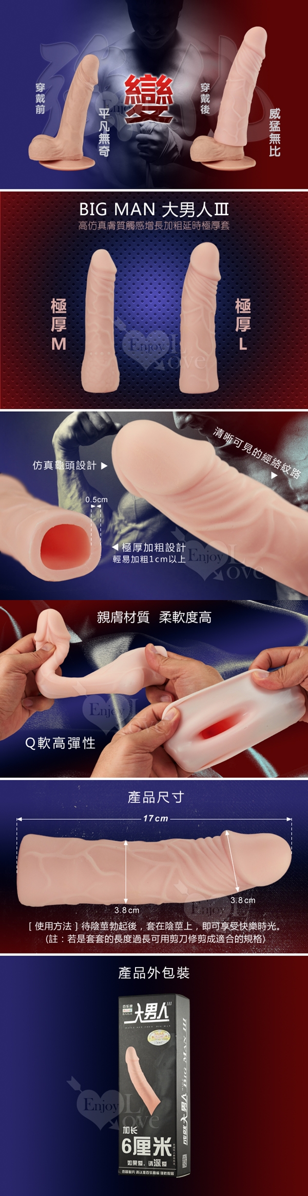 本品有別於一般加強套,除整體仿真度及觸感極優外,它厚度足足有0.5公分可輕易讓您的弟弟加粗2公分以上,給女性一種真實粗壯的感覺,深入陰穴裡那湧漲滿足感,她再也不會意猶未盡了。
