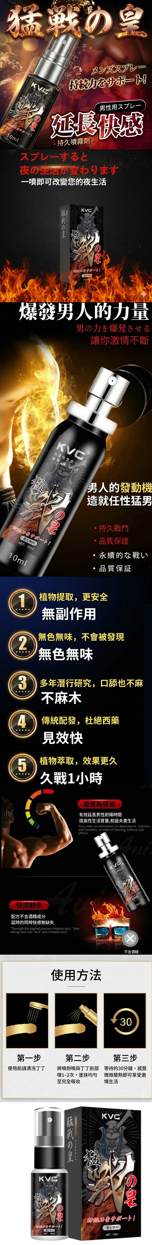 猛戦の皇,主宰你的持久戰場。 一噴覺醒,爆發男人的絕對力量。 不麻木的持久,才是真男人。 KVG 猛戦の皇:讓激情,不再匆匆謝幕。