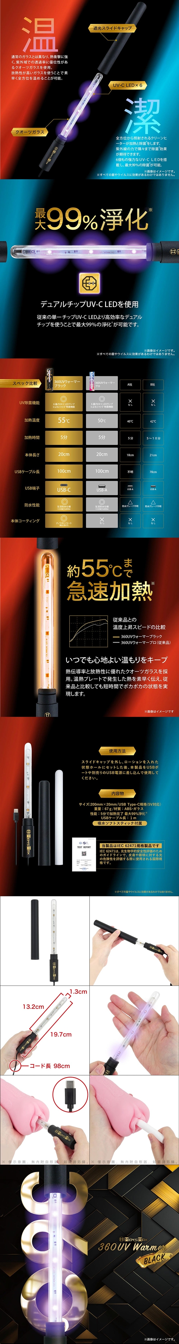 《MEN'S MAX 360UV ウォーマープロ BLACK》IEC 62471に基づき評価されたハイスタンダード仕様。熱衝撃に強く、紫外域での透過率に優れたクオーツガラスを採用し、放熱性の高さによって素早く全方位を温めます。生活防水仕様で、いつでも清潔に使用可能。さらに、オナホールのメンテナンスに便利な吸水ソフトスティックを付属。USB Type-C対応で、ケーブル選びに迷いません。這款潔淨的加熱器集加熱和清新功能於一體。兼具實用性與衛生性,是高品質生活的理想伴侶。【加熱】與一般玻璃不同,這款加熱器採用石英玻璃,具有優異的抗熱衝擊性和紫外線透過率。石英玻璃的高散熱性能使其能夠快速均勻地加熱。符合IEC 62471標準的高標準規格。採用耐熱衝擊的石英玻璃,紫外線透過率極佳,其卓越的散熱性能使其能夠快速向各個方向加熱。日常使用防水,方便清潔,隨時可用。產品還配備吸水軟棒,方便清潔保養。相容於USB Type-C接口,無需擔心線纜選擇問題。●防水(USB接口不防水)●加熱溫度:約55℃●加熱時間:約5分鐘。加熱完成後,加熱器將保持適當的溫度。●設備通電 30 分鐘後將自動關閉。【使用方法】取下滑蓋,將加熱器插入孔中,然後將其插入USB Tpye-C接口或USB Tpye-C電源轉接器(無內附)。●切勿用肉眼直視或間接直視點亮的紫外線燈。這可能會導致眼睛不適。●切勿將紫外線直接或間接照射到皮膚上。這可能會導致皮膚不適。●請勿拆卸或改裝設備。●依使用環境的不同,設備可能會過熱,請留意並小心操作。產品規格用途:自慰器加溫之用材質:樹脂+玻璃規格:加溫型電源:USB Tpye-C直插淨重:約85g總重:約115g尺寸:長19.7x直徑1.3x直徑1.3cm,可深入長約13.2cm、USB線長約98cm外盒尺寸:26x6.5x2.5cm生產商:株式会社エンジョイトイズ產地:中國備註:內附吸濕棒(長約16.3x直徑約1.4cm)x1支注意:請與潤滑液共用.並保存於陰涼處,欲重覆使用.用後清水沖洗。※情趣用品屬於個人衛生用品,經拆封使用,無法接受退換貨!※※每台電腦的解析度皆不同,可能有些微色差,顏色皆以實品為主!※